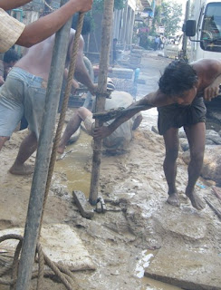 အဲဒီလို ေရျပတ္ခဲ့ရၿပီး ရက္ပိုင္း အၾကာမွာ ၿမိဳ႕လယ္ ရပ္ကြက္ေတြရဲ႕ ရ၀တ သို႔မဟုတ္ ဓမၼာရံုေရွ႕မွာ အ၀ီစိ (စက္ေရတြင္း) တြင္း တူး ေနတာကို ေတြ႕ျမင္ရပါေတာ့တယ္။ ေက်ာက္တံတား ၿမိဳ႕နယ္ထဲက တြင္းတူးေနတဲ့ အဖြဲ႕တဖြဲ႕ကို ေမးျမန္းၾကည့္တဲ့ အခါမွာ ၿမိဳ႕ေတာ္ စည္ပင္က စီမံခ်က္နဲ႔ လုပ္တာ၊ ရပ္ကြက္ေတြ ေရမလာရင္ ေရေပးေ၀ဖုိ႔၊ အခု ၅ ဖြဲ႕ေလာက္ တၿပိဳင္တည္း တူးေနတာ လုိ႔ဆိုပါတယ္။ စက္ေရတြင္းကို လက္နဲ႔ တူးတာပါ။ သံုးေခ်ာင္းေထာက္စင္ ေပၚမွာ ပိုက္ထိန္းမယ့္သူ ႏွစ္ေယာက္ေလာက္က တက္ေနၿပီး ေအာက္မွာ သံပိုက္ကို လူငယ္ႏွစ္ေယာက္က ေရပိုက္ ျဖဳတ္ တပ္ လုပ္တဲ့ ဂြရွင္နဲ႔ ညွပ္ၿပီး ႏြားမ်ား ဆီဆံု လွည့္သလို တပတ္ၿပီး တပတ္ လွည့္ကာ စက္ေရတြင္းတူးၾကတာပါ။ တခ်ိဳ႕ေနရာေတြမွာေတြ႕ရသလို စက္အားနဲ႔ တဂ်ိဳင္းဂ်ိဳင္း ေဆာင့္ကာ တူးတဲ့ စက္ေရတြင္း မဟုတ္ဘဲ လူအားနဲ႔ တူးတာမို႔လို႔ ေပ ၁၅၀ ၀န္းက်င္မွာပဲ ရပ္တန္႔လိုက္ၾကပါတယ္။