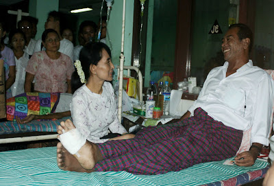 ဇြန္လ ၁၆ ရက္ေန႔က ရန္ကုန္ေဆးရုံႀကီးတြင္ ကုသမႈ ခံယူေနသူ ကုိဘေမာင္ထံ ေဒၚေအာင္ဆန္းစုၾကည္ သြားေရာက္ ေတြ႔ဆုံ အားေပးခ့ဲသည္ (ဓာတ္ပုံ-NLD)