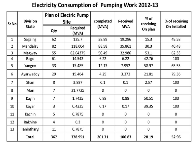 အထက္ပါစာရင္းအရ ေရလိုအပ္ေသာအခ်ိန္သည္ တစ္ႏွစ္လွ်င္ ၁၂လ လစဥ္အခ်ိန္ျပည့္ ျမစ္ေရတင္စက္ကို တင္ေနရမည္မဟုတ္ပါ။ ယခုတင္ျပခ်က္တြင္ တစ္လ က်ပ္သိန္း၁၁၂သိန္း၊ ပံုမွန္သံုးေနသျဖင့္ ျမစ္ေရတင္စက္မွာ ၁၂လလံုး သံုးစြဲေနသည့္ပံုျဖစ္ေနသည္။ အခ်ိဳ႔လမ်ား လယ္ယာမစိုက္ခ်ိန္တြင္ ျမိဳ႔ရြာေရသံုးစရာအတြက္ ေရတင္စက္သံုးေနရသည့္သေဘာရွိသည္။ မည္သုိ႔ပင္ျဖစ္ေစ တစ္ႏွစ္က်ပ္သိန္း၁၃၀၀ခန္႔မွာ ႏိုင္ငံေတာ္အတြက္ အခမဲ့ပံ့ပိုးရမည္ျဖစ္သျဖင့္ ႏိုင္ငံေတာ္သမၼတအမိန္႔ျဖင့္ အရံႈးေပၚေနေသာ လွ်ပ္စစ္ဝန္ၾကီးဌာနအတြက္ ဘတ္ဂ်တ္ထပ္မံပံ့ပိုးေပးရမည္။ တစ္ႏိုင္ငံလံုးတြင္ လွ်စ္စစ္ ေရတင္စက္ေပါင္း ၃၆၇ခုအတြက္ ၁၀၆ မဂၢဝပ္လိုအပ္မည္ျဖစ္သည္။ (ဇယားကိုၾကည့္ပါ)။ မေကြးတိုင္း ျမစ္ေရတင္လွ်ပ္စစ္လိုအပ္ခ်က္သည္ တႏိုင္ငံလံုး၏ တစ္ဝက္ ၅၀.၄၉ ရွိေသာေၾကာင့္ ႏိုင္ငံေတာ္မွ ျမစ္ေရတင္စရိတ္ တစ္ႏိုင္ငံလံုးအတြက္ အခမဲ့ေထာက္ပံလွ်င္ပင္ က်ပ္သိန္းေပါင္း ၂၆၀၀ သာရွိမည္ျဖစ္သည္။ ေဒၚလာအားျဖင့္ US$2.6 million သာရွိမည္။ ပုလဲႏွင့္ေက်ာက္စိမ္း ေရာင္းခ်ရေငြ တစ္ႏွစ္လွ်င္ ေဒၚလာသန္းေပါင္း ၄၀၀၀ခန္႔ ဘယ္ေရာက္သြားပါသနည္း။ လယ္သမားမ်ား ဆင္းရဲမြဲေတမႈအတြက္ ေဒၚလာ ၂.၆သန္းကို အလိုက္သိသိ ထုတ္မေပးပဲ၊ ဆင္းရဲမြဲေတေနေသာ လယ္သမားမ်ား ေအာ္ဟစ္ခ်ိန္ထိ တမင္ေစာင့္ေနသကဲ့သို႔ ျဖစ္သည္။