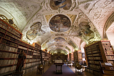 ပရာဟာၿမိဳ႕စြန္ Strahov ရပ္ကြက္မွာရွိတဲ့ ဘုန္းႀကီးေက်ာင္းၿဖစ္လို႔ Strahovský klášter,Strahov Monastery လို႔ေခၚတဲ့ ဘုရားေက်ာင္းႀကီးထဲမွာ စာၾကည့္ခန္းမႀကီးႏွစ္ခု ရွိပါတယ္၊ ဘုရားေက်ာင္း သက္တမ္းက အႏွစ္ရွစ္ရာေက်ာ္ ၾကာခဲ့ၿပီၿဖစ္သလို စာၾကည့္ခန္းမႀကီး ႏွစ္ခုၿဖစ္တဲ့ Theological Hall (Teologický sál) နဲ႔ Philosophical Hall (Filosofický sál) ကလည္း အခုဆိုရင္ ႏွစ္ေပါင္း ၃၃၀ ေက်ာ္ခဲ့ပါၿပီ၊ ေရွးေဟာင္း စာအုပ္စာတမ္းေပါင္း တသိန္းခြဲေက်ာ္ ေရွးပညာရွင္ႀကီးမ်ားရဲ႕ မူရင္း လက္ေရးစာမူေပါင္း ႏွစ္ေထာင္ေက်ာ္ကို သိမ္းဆည္းထားပါတယ္တဲ့၊ ေမာင္ရင္ငေတတို႔ကေတာ့ ငယ္ငယ္ေက်ာင္းသားဘဝက ရပ္ကြက္ထဲမွာရွိတဲ့ စာအုပ္အငွားဆိုင္ကေန ရုပ္ၿပကာတြန္းစာအုပ္ မဂၢဇင္းစာအုပ္ သိုင္းစာအုပ္အတြဲလိုက္ေလာက္ကိုသာ ငွားရမ္းဖတ္ရႈေနၾက ဆိုေတာ့ကာ ဒီလိုမ်ိဳး က်မ္းႀကီးက်မ္းငယ္ေတြကိုေတာ့ ဖတ္ရႈေလ့လာဖို႔ စိတ္မဝင္စားတာေၾကာင့္ အဲဒီလိုေရွးေဟာင္းက စာၾကည့္ခန္းမလိုမ်ိဳးကို သိပ္စိတ္မဝင္စားလို႔ အတြင္းထဲေတာ့ မဝင္ေရာက္ခဲ့ေၾကာင္းပါ၊ ဘာသာ စကားကလည္း ေမြးရာပါ စကားကိုေတာင္မွ ေတာင္တလံုးေၿမာက္တလံုးေလာက္သာ တတ္တာ ေၾကာင့္လည္း ဒီလို ပိဋကတ္တိုက္ႀကီးအထဲကို ဝင္ေရာက္ဖို႔ စိတ္မပါတာကလည္း တေၾကာင္းပါ၊ အေၾကာင္းသင့္လို႔ ေရႊၿပည္ေတာ္ႀကီးဆီသို႔ ၿပန္လည္ေရာက္ရွိခဲ့ရင္ေတာ့ ၿမန္မာႏိုင္ငံလံုးဆိုင္ရာ အမ်ိဳးသားစာၾကည့္တိုက္ႀကီး ရွိရာကို ရွာေဖြသြားေရာက္ၿပီး ကိုယ္တတ္တဲ့ ဘာသာစကားေလးနဲ႔ ကိုယ္ဖတ္ႏိုင္တဲ့ စာကေလး ေပကေလးမ်ားကိုေတာ့ ဖတ္ခ်င္မိေၾကာင္းပါခင္ဗ်ာ။
