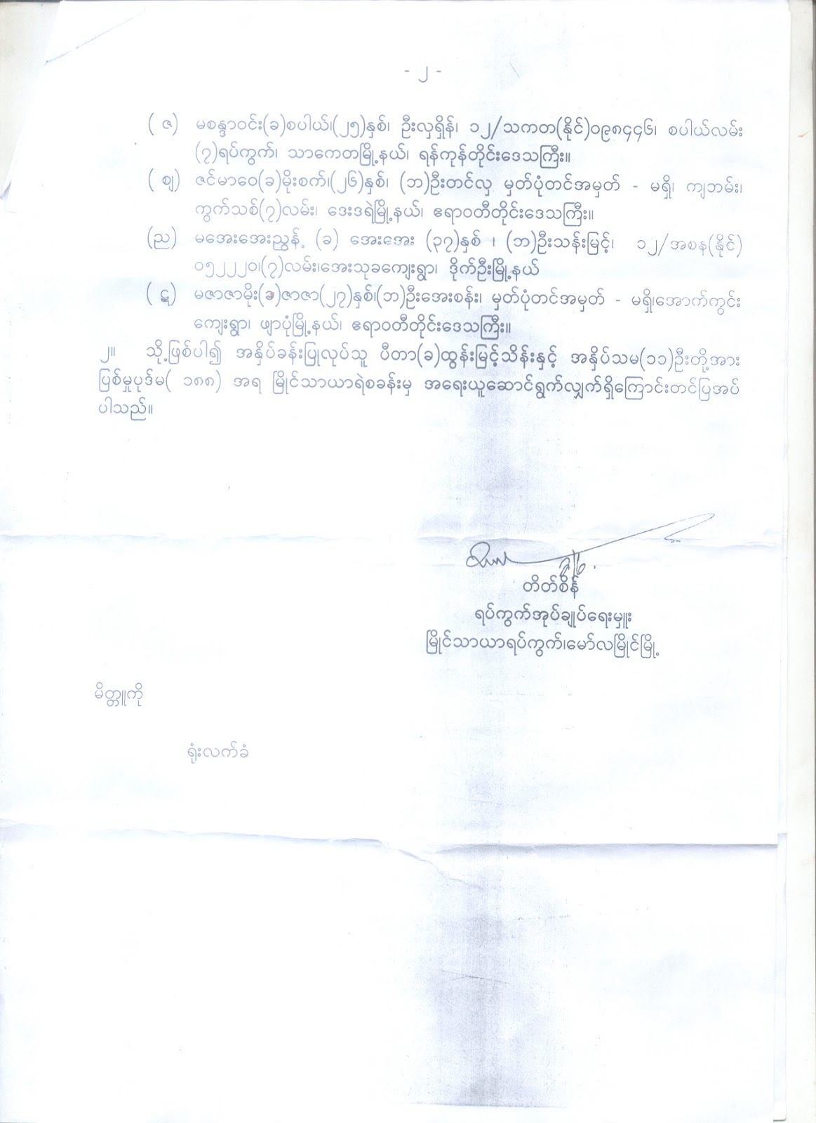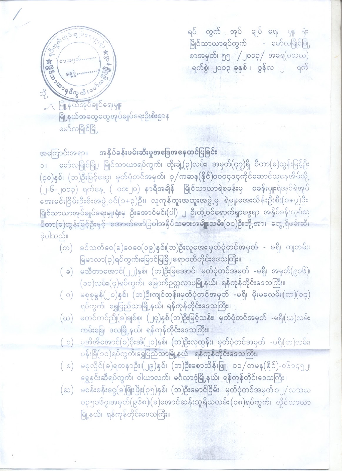 ထိုကဲ့သို႔ မြန္ျပည္နယ္၊ ေမာ္လၿမိဳင္ၿမိဳ႕ တြင္ အုပ္ခ်ဳပ္ေရးမ႑ိဳင္ႏွင့္ တရားစီရင္ေရးမ႑ိဳင္တို႔၏ အက်င့္ပ်က္ျခစားကာ ေဆာင္ရြက္ေန မႈမ်ားေၾကာင့္ ၿမိဳင္သာယာရပ္ကြက္ အတြင္းတြင္ အႏွိပ္ခန္း အမည္ခံျပည့္တန္ဆာခန္းမ်ား တေန႔တျခားတိုးတက္မ်ားျပားလွ်က္ရွိေနေသာေၾကာင့္ သက္ဆိုင္ရာမွ လိုအပ္သလိုအေရးယူေဆာင္ရြက္ေပးႏိုင္ပါရန္ တင္ျပအပ္ပါသည္။