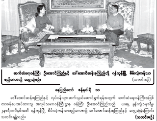 ႎုိင္ငံေတာ္ရဲႛ ၀န္႒ကီးတစ္ေယာက္က ေဒၞစုနဲႛေတၾႛဆုံခ့ဲတယ္ဆုိတ့ဲ သတင္းကုိ ဴမန္မာ့အလင္းသတင္းစာမႀာလည္း ေဖာ္ဴပခ့ဲပၝတယ္။ ၁နာရီ ၁၀ မိနစ္ ဳကာတယ္ဆုိေပမယ့္ ေတၾႛတယ္ဆုိတ့ဲ အခဵက္တစ္ခုပဲ ပၝပၝတယ္။ စကားေဴပာဳကသလား၊ ေဆၾးေႎၾးဳကသလား ဆုိတာေတၾေတာ့ မပၝ၀င္ပၝဘူး။ ထုတ္ဴပန္တ့ဲပုံေတၾကုိ ဳကည့္ရတာကေတာ့ စကားေတာ့ ေဴပာေနဳကပုံ ရိႀပၝရဲႛ။