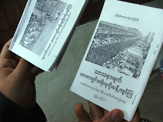 ဴမန္မာႎုိင္ငံအတၾင္း လႀဵႂိႚ၀ႀက္ဴဖန္ႚေ၀ေနဳကေသာ စာအုပ္ငယ္မဵား။ ပုံတၾင္ ေတၾႚရေသာ စာအုပ္ငယ္ ၂အုပ္တၾင္ စာမဵက္ႎႀာ ၃၃ မဵက္ႎႀာစီပၝရိႀ႓ပီး၊ စစ္အစုိးရ စိတ္တုိင္းကဵ ေရးဆဲၾထားသည့္ ဖၾဲႚစည္းအုပ္ခဵႂပ္ပံု အေဴခခံဥပေဒအေဳကာင္း ေ၀ဖန္သုံးသပ္ထားသည့္ ဴပတ္ဴပတ္သားသား ဆန္ႚကဵင္ဳကပၝစုိႚ အမည္ရိႀ စာတမ္းတစ္ေစာင္ကုိ ထည့္သၾင္းပုံႎႀိပ္ထားသည္။ မဵက္ႎႀာဖုံးတၾင္ သာသနာဖဵက္အာဏာရႀင္အစုိးရကုိ ဆန္ႚကဵင္ဳက၊ လူသတ္သမားအာဏာရႀင္အစုိးရကုိ ဆန္ႚကဵင္ဳက၊ ေကဵာင္းသားလူငယ္မဵား ဒီမုိကရက္တစ္အစည္းအရုံး(ဴမန္မာႎုိင္ငံ) စသဴဖင့္ ေဖာ္ဴပထားသည္။ (ဓာတ္ပုံ-မုိးမခ)