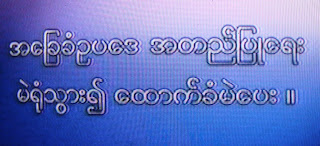 ကန္ႚကၾက္မဲထည့္ဳကဖိုႚ အတိုက္အခံက ေဳကညာခဵက္ေတၾ ထၾက္လာဴပီး စစ္အစိုးရကဖက္လည္း ေထာက္ခံမဲအတၾက္ အရႀိန္ဴမႀင့္စည္းရုံးေနပၝတယ္။ ရုပ္ဴမင္သံဳကားေပၞက စာေတၾကို ဳကည့္ပၝ။ ရပ္ကၾက္ထဲမႀာကေတာ့ ေထာက္ခံမဲထည့္မႀ မီးမႀန္မႀန္လာမည္လိုႚ စည္းရုံးေနပၝသတဲ့။ (မိုးမခ-ရန္ကုန္)