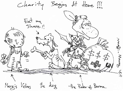 >Cartoon Maung Yit – Charity Begins at Home (end at the pocket of the Burmese Generals)