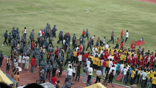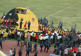 ထိုအခ်ိန္တြင္ အႏိုင္ရသည့္ အသင္းမ်ားကို ဆုေပးမည့္ အားကစား ၀န္ႀကီး ၏ လံုၿခံဳေရးအတြက္ ကြင္းထဲေရာက္ေနသည့္ ေအာင္ပြဲခံခဲ့ၾကသည့္ ပရိသတ္ကို လံုထိန္းမ်ားက ေသနတ္ျဖင့္ခ်ိန္ကာ ဟန္႔တားေမာင္းထုတ္ခဲ့သည့္ ျဖစ္ရပ္ ျဖစ္ပြားခဲ့ျခင္းျဖစ္သည္