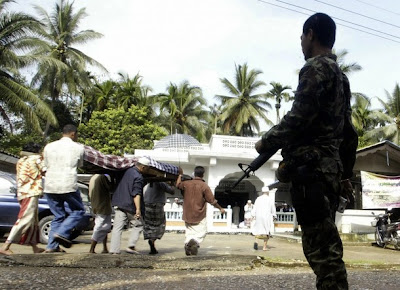 ရုပ္အေလာင္းတခုကုိ ဗလီသုိ႔သယ္ေဆာင္သြားေနေသာ ယမန္ေန႔က ရာလာ့ခရုိင္ ေက်းရြာတရြာမွျမင္ကြင္း။ ယမန္ေန႔က ဗုံးခဲြ၊ ပစ္ခတ္တုိက္ခုိက္မႈမ်ားႏွစ္ႀကိမ္ျဖစ္ပြားခ့ဲရာ အစၥလာမ္ဘာသာ၀င္ အရပ္သားသုံးဦး၊ ဗုဒၶဘာသာ၀င္ ပုလိပ္တဦး ေသဆုံးခ့ဲသည္။ ထုိင္းေတာင္ပုိင္းေဒသတြင္ လြန္ခ့ဲသည့္ ၅ ႏွစ္ခန္႔မွ စ၍ တုိက္ခုိက္မႈမ်ား ျဖစ္ပြားလ်က္ရိွသည္။ (photos: AFP, AP, Reuters)