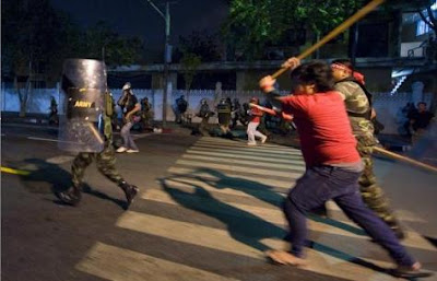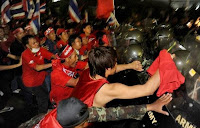 ထုိင္းႏုိင္ငံ ဘန္ေကာက္ျမိဳ႕ေတာ္တြင္ အစုိးရဆန္႔က်င္သူမ်ားက အက်ႌအနီေရာင္ ၀တ္ဆင္ၿပီး ဆႏၵျပကန္႔ကြက္ေနၾကသည္။ ဆႏၵျပမႈကုိ တားဆီးသည့္ စစ္သားမ်ားကုိလည္း ရန္မူၾကသည္။ အဆုိပါ ဆႏၵျပသူမ်ားသည္ ယခင္ ၀န္ႀကီးခ်ဳပ္ေဟာင္း မစၥတာ သက္ဆင္ကုိ ေထာက္ခံၾကသူမ်ားျဖစ္သည္။ (ဓာတ္ပုံ – AFP, Reuters)