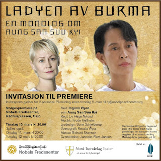 ေနာ္ေ၀ႏိုင္ငံ၊ အိုစလိုျမိဳ႔၊ ႏိုဘယ္ျငိမ္းခ်မ္းေရးျပခန္းမွာ ျမန္မာျပည္က လူထုေခါင္းေဆာင္ ေဒၚေအာင္ဆန္းစုၾကည္နဲ႔တကြ ႏိုင္ငံေရးအက်ဥ္းသားတို႔ရဲ႔ ဘ၀ကို သရုပ္ေဖာ္ျပီး တင္ဆက္မယ့္ ေအာ္ပရာ(ျပဇာတ္)တခုကို မတ္လ ၁၀ ရက္မွာ က်င္းပမယ္လို႔သိရပါတယ္။