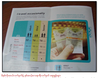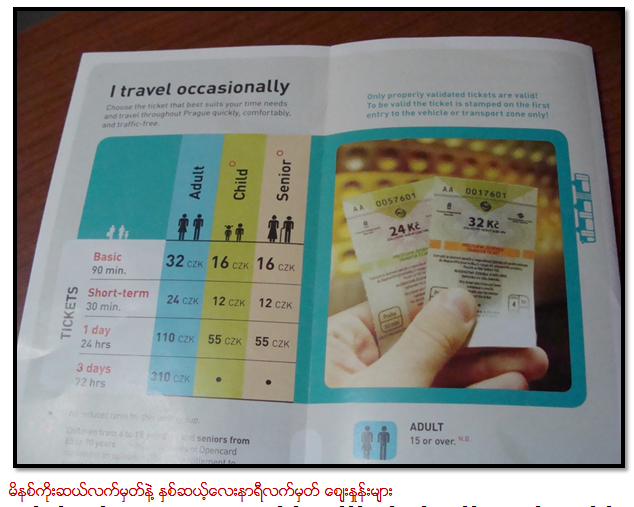 လက္မွတ္ေစ်းႏႈန္းေတြကေတာ့ ေစ်းမ်ားတယ္လို႔ မဆိုႏိုင္ေသာ္လည္း သိပ္ေတာ့သက္သာတယ္လို႔ မဆိုႏိုင္ၿပန္ပါဘူး၊ ပံုမွန္လက္မွတ္တေစာင္ကို ၃၂ ခရူနာ Koruna česká (CZK) ေပးလိုက္ရင္ မိနစ္ ၉၀ ဆင္းလိုက္ တက္လိုက္ စိတ္ႀကိဳက္လုပ္ၿပီး စီးႏိုင္ပါတယ္၊ ႏွစ္ဆယ့္ေလးနာရီလက္မွတ္ ဒီကေန႔ မနက္ ၉ နာရီက စၿပီးစီးတယ္ဆိုရင္ ေနာက္တေန႔မနက္ ကိုးနာရီထိ စီးလို႔ရတဲ့ တေန႔စာ လက္မွတ္ ပံုစံမ်ိဳးကို ခ်က္ေငြ ခရူနာ ၁၁၀ ေပးခဲ့ရပါတယ္၊ သံုးရက္လက္မွတ္က ၃၁၀ ငါးရက္လက္မွတ္ဆိုရင္ ၅၀၀ ေပးရမွာပါ၊ တဘူတာ မွတ္တိုင္တတိုင္သာ သြားရမွာဆိုရင္ေတာ့ နာရီဝက္အတြင္း သံုးလို႔ရတဲ့ ၂၄ ခရူနာတန္ လက္မွတ္လည္း ရွိပါေသးတယ္၊ သံုးစြဲၾကတဲ့သူနည္းပါးတဲ့ လက္မွတ္အမ်ိဳးအစားပါ၊ လက္မွတ္ေတြကိုေတာ့ ဘူတာရံုမွာ ေရာင္းခ်တာအၿပင္ လမ္းေဘး ကုန္စံုဆိုင္ အေသးေလးေတြမွာ ေရာင္းပါတယ္၊ အခုဆိုရင္ လက္ကိုင္ဖုန္းကေန SMS ပို႔ၿပီးဝယ္ယူလို႔ ရေနပါၿပီ၊ လက္မွတ္ေစ်းႏႈန္း ေတြကေတာ့ ဒီကေန႔ ခ်က္ေငြ ေပါက္ေစ်းအရ တယူရိုေပးရင္ ၂၅ ခရူနာရေတာ့ မိနစ္ကိုးဆယ္စီး လို႔ရတဲ့ လက္မွတ္တေစာင္ တယူရိုခြဲနီးပါး တရက္ဆိုရင္ ေလးယူရိုခြဲေလာက္ က်သင့္ေနလို႔ တၿခား ဥေရာပရဲ႕ ၿမိဳ႕ႀကီးေတြက လက္မွတ္ေစ်းႏႈန္းနဲ႔ ႏိႈင္းယွဥ္ၾကည့္လိုက္ရင္ ေစ်းသက္သာလွတယ္ေတာ့ ေၿပာလို႔မရပါဘူး၊ ပရာဟာၿမိဳ႕ေပၚမွာ အေၿခစိုက္ ေနထိုင္သူေတြ အတြက္ကေတာ့ လေပးလက္မွတ္ ဝယ္ရင္ ၅၅၀ ခရူနာ ဆိုေတာ့ကာ ေခတၱခဏ လာေရာက္လည္သူေတြအတြက္ ငါးရက္စာေပးရတဲ့ လက္မွတ္တန္ဖိုးနဲ႔ အတူတူ ၿဖစ္ေနတာပါ၊