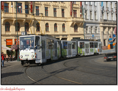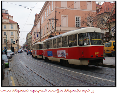 ေၿမေပၚမွာေၿပးဆြဲေနတဲ့ဓါတ္ရထားမ်ားကေတာ့ ေဆးေရာင္အမ်ိဳးမ်ိဳး ေၾကာ္ၿငာဒီဇိုင္းအမ်ိဳးမ်ိဳးေတြ ေရးခ်ယ္ထားလို႔လား မသိပါဘူး၊ ၾကည့္လို႔မရိုးႏိုင္သလို ဓါတ္ပံုရိုက္မွတ္တမ္းတင္လို႔လည္း မဆံုးႏိုင္ ပါဘူး၊ ဓါတ္ရထားလမ္းေတြရယ္ ကားလမ္းေတြရယ္ ဆိုင္ကယ္ေတြ စက္ဘီးေတြရယ္ လူေတြရယ္ ဓါတ္တိုင္ေတြ ဓါတ္ႀကိဳးေတြနဲ႔ ေရာေထြးၿပီး ရႈတ္ရွက္ခတ္ေနတာကေတာ့ ပရာဟာၿမိဳ႕လယ္ေခါင္က လမ္းမမ်ားပါဘဲ၊ ဥေရာပဘယ္ၿမိဳ႕မွာမွ ဒီေလာက္ရႈတ္တာ မရွိဘူးလို႔ ထင္ပါတယ္၊ ဒီဓါတ္ရထားေခၚ