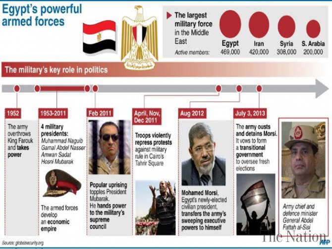သည္လိုုနဲ႔ ၂၀၁၃ ႏွစ္အတြင္း ၆ လတာ ကာလအားလုုံးမွာ လမ္းေပၚက လူထုုတိုုက္ပြဲေတြ သပိတ္တိုုက္ပြဲေတြ တျခိမ္းျခိမ္း ျဖစ္ေနခဲ့ရာက တပ္မေတာ္က (ၾကား၀င္)ျပီးေတာ့ လက္ရွိ ေမာ္စီအစိုုးရက ဇူလိုုင္ ၃ မတိုုင္ခင္ အေထြေထြျပသနာမ်ား ေျဖရွင္းရန္၊ မေျဖရွင္းက အာဏာကိုု ျပန္သိမ္းမယ္လိုု႔ ထုုတ္ျပန္တဲ့အထိ ျဖစ္ရာက ေနာက္ဆုုံး ဇူလိုုင္ ၄ မွာ တပ္မေတာ္က (အဲေလ) အီဂ်စ္တပ္မေတာ္ၾကီးကေနျပီး ျငိမ္းခ်မ္းစြာနဲ႔ အာဏာကိုုသိမ္း၊ ေမာ္စီနဲ႔ မူဆလင္ညီအကိုုေတာ္ပါတီ အေပါင္းအပါေတြကိုု ဖမ္းဆီးထိန္းသိမ္းျပီး ေျဖရွင္းလိုုက္ေၾကာင္းပါ။