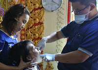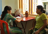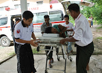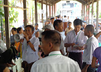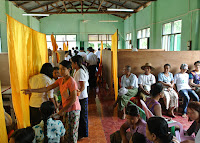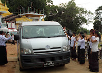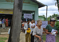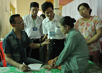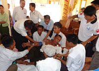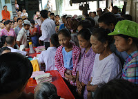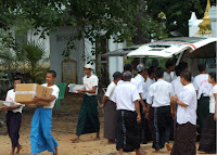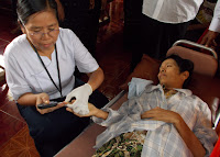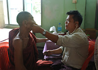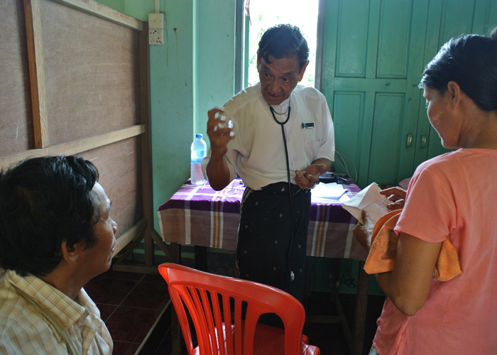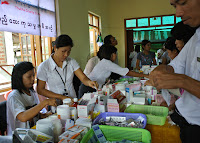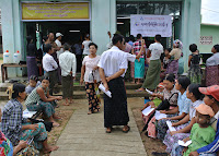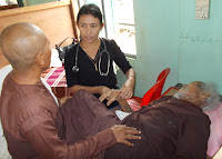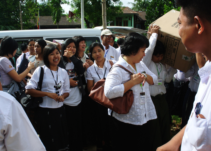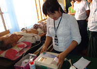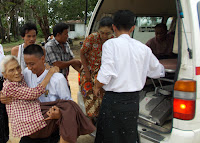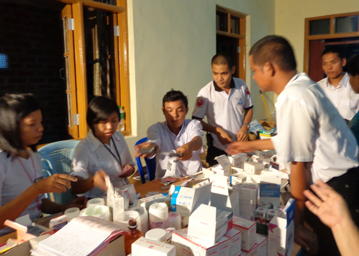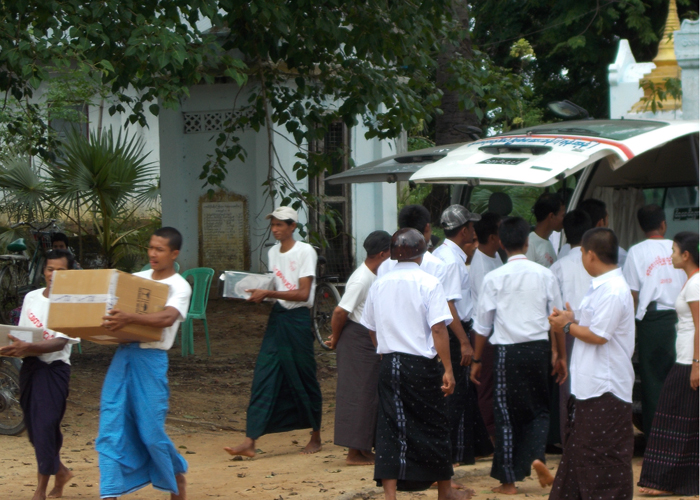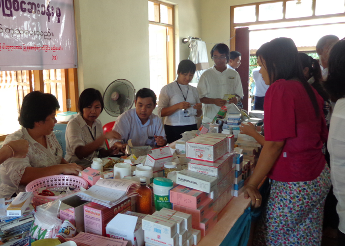 နံနက္ (၉းဝဝ) နာရီအခ်ိန္တြင္ ဆိုက္ေရာက္ခဲ့ၿပီး ေဆးဝါးပစၥည္း အထုပ္ ႀကီးငယ္မ်ားကို ေမာ္ေတာ္ယာဥ္ေပၚမွ ေဆးကုသမည့္ ဓမၼ႐ံုေပၚသို႔ သယ္ယူေပးၾကသည့္ လူမႈေရးသမား မ်ား၏ ရင္းႏွီးေပးဆပ္ၾကသည့္ လုပ္အားသည္လည္း မွတ္တမ္းတင္စရာ။ ေဆးဝါးလာေရာက္ ကုသၾကသူ မ်ားတစ္ခ်ိဳ႕၊ ကိုယ္ကာယ အားေကာင္းသူတစ္ခ်ိဳ႕ ဝုိင္းဝန္း၍ သယ္ယူလုပ္အားေပးၾကသည္။ သူတို႔လည္း သူတို႔ေပးႏိုင္တာ ျပန္လည္ကူညီေပးၾကျခင္း ျဖစ္သည္။ ေမာ္ေတာ္ယာဥ္ေပၚမွ သုခကုသိုလ္ျဖစ္ေဆးခန္းမွ ဆရာဝန္မ်ားႏွင့္ နာေရးကူညီမႈအသင္း(ရန္ကုန္) အဖြဲ႔သူ/သားမ်ားသည္ ေအာက္သို႔ဆင္း၍ ေဒသခံ လူမႈေရးသမားမ်ားတို႔မွ ေႏြးေထြးစြာ ႀကိဳဆိုခဲ့ၾကၿပီး မဟာပုညဘုရားႀကီးေက်ာင္းမွ ဝိသာခါဓမၼာ႐ံုႀကီးတြင္ ေဆးဝါးကုသရန္ ေရာက္႐ွိေနၾကသူမ်ား ထဲတြင္ အသက္အ႐ြယ္ အိုမင္းရင့္ေရာ္ေသာ အဘိုးအဘြားမ်ား၏ အ႐ိုးၿပိဳင္းၿပိဳင္း၊ အေရလိပ္ေနေသာ လက္မ်ားပင္ ကတုန္ယင္႐ွိၾကၿပီး ကၽြန္ေတာ္တို႔ကို ေငးေမာၾကည့္ ေနေသာ သူတို႔၏ မ်က္လံုးမ်ားထဲတြင္ ယံုၾကည္အားကိုးမႈ၊ ဝမ္းနည္းဝမ္းသာမႈမ်ား ေရာင္စံုအရိပ္ထင္ ေနသည္။ တုန္ယင္လိႈက္လွဲေသာ ဝမ္းေျမာက္ႀကိဳဆိုမႈ အဟုန္ေၾကာင့္ သူတို႔၏ မ်က္ဝန္းမ်ားထဲမွ ဝမ္းနည္းဝမ္းသာ မ်က္ရည္မ်ားသည္ အျပင္မွ မိုးစက္မ်ားႏွင့္အၿပိဳင္ စီးက်ေနသည္။ ေဒသခံလူမႈေရး အသင္းျဖစ္သည့္ “သက္ႀကီး႐ြယ္အိုကုသိုလ္ျပဳ က်န္းမာေရးေစာင့္ေ႐ွာက္မႈအသင္း”မွ လူမႈေရးသမားမ်ား တို႔သည္ ယင္းေန႔၊ ယင္းရက္တြင္ ရန္ကုန္ၿမိဳ႕႐ွိ ဦးေက်ာ္သူ၏ နာေရးကူညီမႈအသင္း(ရန္ကုန္)မွ သုခ ကုသိုလ္ျဖစ္ေဆးခန္းမွ ဆရာဝန္ႀကီးမ်ား အခမဲ့ လာေရာက္၍ ေဆးဝါးကုသမည္ျဖစ္ေၾကာင္း တစ္႐ြာဝင္ တစ္႐ြာထြက္၍ ႏိႈးေဆာ္ထားမႈသည္ မည္သည့္အက်ိဳးမွ် ေမွ်ာ္ကိုးသည္မဟုတ္ေသာ ႐ြာသူ/သားမ်ား သည္လည္း ပါဝင္ေပါင္းစည္းလာၾကသည္။ ႐ုပ္ဝတၳဳပစၥည္း ပမာဏထက္ မည္သည့္ အေသြးအေရာင္ စြန္းထင္းမႈမ်ားမ႐ွိေသာ အမ်ား၏ႀကီးမား မြန္ျမတ္သည့္ ပါဝင္ေပါင္းစည္းမႈ စိတ္ရင္းေစတနာမ်ား ျဖစ္သည္။