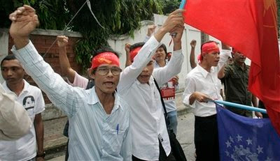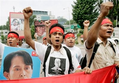 ဇူလုိင္ ၈၊ ၂၀၀၉ ဘန္ေကာက္ၿမိဳ႕ ျမန္မာသံရုံးေရွ႕ ဆႏၵျပမႈ ျမင္ကြင္း။ ယမန္ေန႔က က်ေရာက္သည့္ ရန္ကုန္တကၠသုိလ္ ေက်ာင္း၀င္းအတြင္းရိွ ေက်ာင္းသားသမဂၢ အေဆာက္အဦး ဗုံးခဲြခံရမႈ ႏွစ္ပတ္လည္ေန႔တြင္ ျမန္မာသံရုံးေရွ႕သုိ႔ သြားေရာက္ ဆႏၵျပၾကျခင္း ျဖစ္သည္။ (ဓာတ္ပုံ-AP) ေတာင္ကုိရီးယားႏုိင္ငံ ၿမိဳ႕ေတာ္၊ ဆုိးလ္ၿမိဳ႕ ျမန္မာသံရုံးေရွ႕ ဆႏၵျပမႈမ်ား။ (ဓာတ္ပုံမ်ား – Reuters )