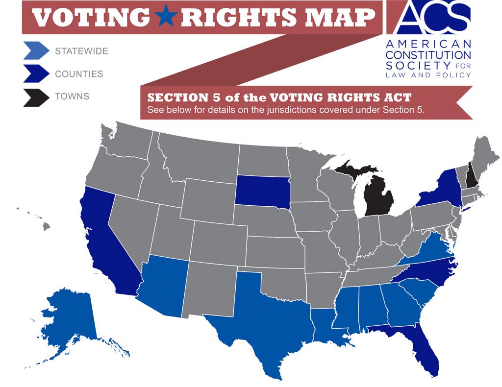 အဲသည္မွာ ယခင္ေက်းကၽြန္စနစ္ကိုု အားေပးခဲ့တဲ့ ေတာင္ပိုုင္းျပည္နယ္ေတြ (အယ္လဘမား၊ အယ္လစကာ၊ အာရီဇိုုးနား၊ ေဂ်ာ့ဂ်ီယာ၊ လူ၀ီစီးနီးယား၊ ၀စၥကြန္စင္၊ ကုုိလိုုရားနား(ေတာင္ပိုုင္း)၊ တကၠဆပ္၊ ဗားဂ်ီးနီးယား) ျပည္နယ္အစုုိးရေတြက လူမည္းေတြကိုု မဲေပးတာ ကန္႔သတ္ခ်ဳပ္ျခယ္တဲ့ ဥပေဒေတြ ျပဌာန္းေလ့ရွိတယ္။ ႏိုုင္ငံသားမွတ္ပုုံတင္ ျပခုုိင္းတာ၊ စာတတ္မတတ္ စစ္တာ၊ မဲရုုံေတြကိုု လူမည္းေတြ မလာႏိုုင္တဲ့ ေနရာေတြမွာ သြားဖြင့္တာေတြ လုုပ္လြန္းလိုု႔ ေနာက္ဆုုံးမွာ ၁၉ ၆၅ မဲေပးခြင့္ဥပေဒကိုု ျပည္ေထာင္စုုက ျပဌာန္းျပီး အဲသည္ျပည္နယ္ေတြက အသားအေရာင္ခြဲျခားတဲ့ မဲေပးခြင့္ကိုု ခ်ဳပ္ျခယ္တဲ့ ကန္႔သတ္တဲ့ ဥပေဒေတြကိုု ျပည္နယ္အဆင့္ သတ္မွတ္ခြင့္ မရွိေအာင္ တားျမစ္ခဲ့တာ ျဖစ္ပါတယ္။