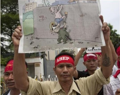 ယမန္ေန႔က ျမန္မာ့အေရး လႈပ္ရွားသူမ်ား ထိုင္းႏိုင္ငံ ဘန္ေကာက္ၿမိဳ ႔ရိွ တရုတ္သံရံုးေရွ႕သုိ သြားေရာက္ၿပီး ျမန္မာ စစ္အစိုးရႏွင့္ ဂြ်န္ယက္ေတာ တို႔ကို ေ၀ဖန္ သေရာ္ ထားသည့္ ကာတြန္း ပိုစတာမ်ား ကုိင္စြဲကာ ဆႏၵျပၾကသည္။ (ဓာတ္ပုံ-AP)