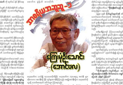 ေၾကးမုံဦးေသာင္း၏ ေဆာင္းပါးတပုဒ္ကုိ စက္တင္ဘာ ၁၈ ရက္ေန႔ (ေသာၾကာေန႔ထုတ္) လွ်ပ္တစ္ျပက္ ဂ်ာနယ္တြင္ ျပန္လည္ေဖာ္ျပထားသည္ကုိ ေတြ႔ရသည္။