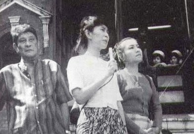 ကြ်န္ေတာ္တုိ႔ ေခါင္းေဆာင္၊ ကြ်န္ေတာ္တုိ႔ လမ္းျပ ေဒၚေအာင္ဆန္းစုၾကည္ သည္ပင္လွ်င္ ျမန္မာျပည္မွာ ပထမဆုံး လူထုကုိ မိန္႔ခြန္းေျပာခ့ဲတာက ၁၉၈၈ ၾသဂုတ္ ၂၄ ရန္ကုန္ေဆးရုံႀကီး၊ ႏွလုံးေရာဂါေဆာင္ေရွ႕က ကြ်န္ေတာ္တုိ႔ စာေပ အႏုပညာရွင္မ်ားရဲ႕ စင္ျမင့္ကပဲ မဟုတ္ပါလား။