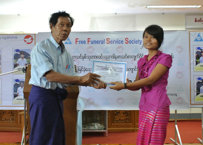 ၂ဝ၁၃ ခုႏွစ္ ဇြန္ (၁၅) ရက္ေန႔ ေန႔လည္ (၂းဝဝ) နာရီအခ်ိန္တြင္ နာေရးကူညီမႈအသင္း(ရန္ကုန္)၏ “သုခ အလင္းပညာဒါန”မွ ဖြင့္လွစ္ခဲ့သည့္ စာသင္စာက်က္ဝိုင္းသုိ႔ တက္ေရာက္သင္ၾကားခဲ့ၿပီး ၂ဝ၁၂/၁၃ ပညာသင္ႏွစ္ တကၠသိုလ္ဝင္တန္းတြင္ ေအာင္ျမင္ခဲ့ၾကသည့္ ေက်ာင္းသား/သူမ်ားအား ဂုဏ္ျပဳျခင္းအခမ္းအနားတစ္ရပ္ နာေရး ကူညီမႈအသင္း(ရန္ကုန္)တြင္ က်င္းပျပဳလုပ္ခဲ့သည္။