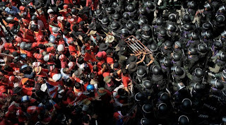 တလတာၾကာျပီျဖစ္သည့္ ထိုင္းႏိုင္ငံ၊ ဘန္ေကာက္ျမိဳ႔ေပၚက အစိုးရဆန္႔က်င္ေရး ဆႏၵျပပြဲျမင္ကြင္း။ ျပဳတ္က်သြားသည့္ ထိုင္း၀န္ၾကီးခ်ဳပ္ သပ္စင္ကို ေထာက္ခံသည့္ ရွပ္နီ၀တ္မ်ားက ဘန္ေကာက္ျမိဳ႔ေပၚတြင္ ပိတ္ဆို႔ဆႏၵျပလ်က္ရွိရာ၊ ယေန႔ စစ္တပ္ႏွင့္ ထိပ္တိုက္ရင္ဆိုင္မႈမ်ား ျဖစ္ပြားသည္။ ရိုက္တာသတင္းေထာက္ ဂ်ပန္ႏိုင္ငံသားတဦးအပါအ၀င္ လူေပါင္း ၁၅ ဦးေက်ာ္ ေသဆုံးျပီး လူေပါင္း ၇၀၀ နီးပါး ထိခုိက္ခဲ့သည္ဟု ဆိုသည္။ ယခုအခ်ိန္ထိ အာဏာပိ္ုင္တို႔ႏွင့္ ဆႏၵျပသူတို႔ တင္းမာဆဲ ျဖစ္သည္။