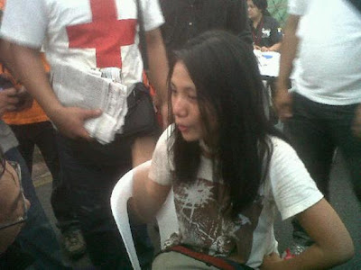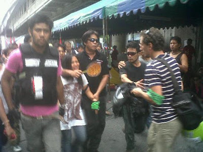 ဘန္ေကာက္တြင္ အၾကမ္းဖက္ ဆႏၵျပေနေသာ ရွပ္နီမ်ားက ယေန႔ ဖမ္းဆီးလုိက္သည့္ အမ်ဳိးသမီး တဦး။ ထုိအမ်ဳိးသမီးသည္ ဧရာ၀တီမဂၢဇင္းမွ သတင္းေထာက္မ်ားအတြက္ ဘာသာျပန္ေပးေနသူ ျဖစ္ေၾကာင္း၊ နာရီပုိင္းအတြင္း ျပန္လြတ္ေပးလုိက္ေၾကာင္း သိရသည္။