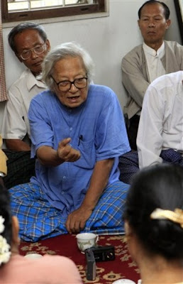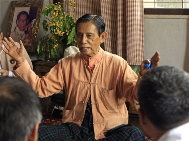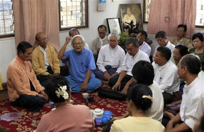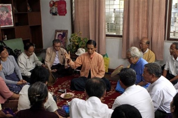 ေရြးေကာက္ပဲြ အႏွစ္ ၂၀ ျပည့္ အထိမ္းအမွတ္ပဲြတြင္ ေတြ႔ရေသာ NLD ေခါင္းေဆာင္မ်ား။ အထိမ္းအမွတ္ပဲြကုိ ရန္ကုန္ၿမိဳ႕ရိွ NLD ဒုဥကၠ႒ ဦးတင္ဦး၏ ေနအိမ္တြင္ ျပဳလုပ္ခ့ဲသည္။ ေဒၚေအာင္ဆန္းစုၾကည္၏ ညႊန္ၾကားခ်က္အရ ႏုိင္ငံေရး အခမ္းအနားကုိ ရုံးျပင္ပတြင္ ျပဳလုပ္ျခင္း ျဖစ္သည္ဟု ဆုိသည္။ (ဓာတ္ပုံမ်ား – AP)