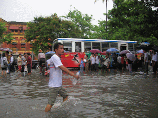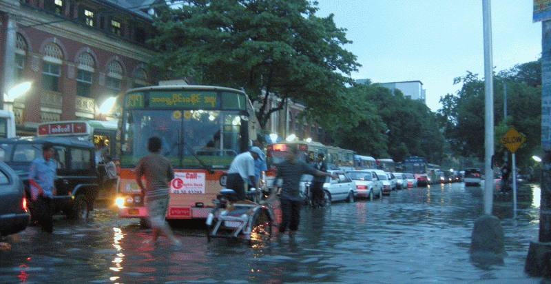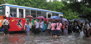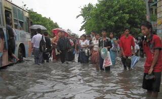` ရန္ကုန္ၿမိဳ႕တြင္ ယေန႔မြန္းလြဲပိုင္း ၂နာရီ၀န္းက်င္မွ စတင္ရြာသြန္းၿပီး ရံုးဆင္းခ်ိန္တိုင္ ၂နာရီေက်ာ္ရြာသြန္းသည့္ မိုးေၾကာင့္ လမ္းမ်ားတြင္ ေရလွ်ံၿပီး ဒူးဆစ္ထိျမဳပ္သည့္ ေရထဲတြင္ ေမာင္းႏွင္ေနၾကသည့္ ႏွစ္ၾကာေဟာင္းအိုေနသည့္ ကိုယ္ပိုင္ႏွင့္ တက္စီကားမ်ား ထိုးရပ္ကုန္ၿပီး လမ္းမ်ားပိတ္ဆို႔ကာ လိုင္းကားမ်ား ေျပးဆြဲမႈ ေလ်ာ့နည္းသြားျခင္း၊ ေရႀကီးမႈေၾကာင့္ ဆိုးရြားစြာ လမ္းပိတ္ဆို႔မွႈ ျဖစ္ေပၚကာ အလုပ္ျပန္၊ ရံုးျပန္မ်ား အိမ္ျပန္ရန္ အခက္အခဲ ႀကံဳေတြ႕ခဲ့ရသည္။