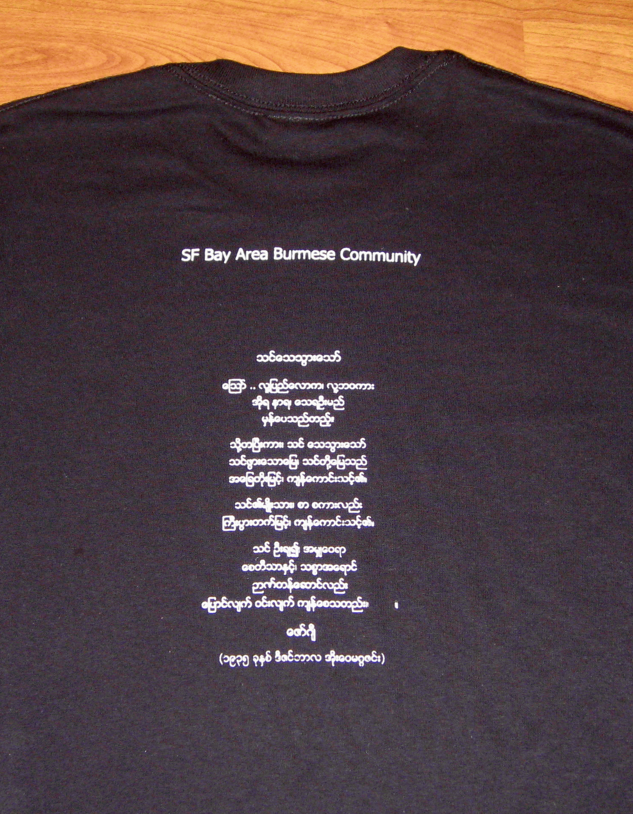 (ဓာတ္ပုံမွာ – အလွဴပြဲေတာ္မွာ အမွတ္တရ ၀ယ္ယူအားေပးလွဴဒါန္းႏိုင္မည့္ တီရွပ္ ေရွ႔ႏွင့္ ေနာက္ေက်ာ ျမင္ေတြ႔ရပုံ ႏွင့္ ျပည္သူ႔ဂုဏ္ရည္မိတ္ေဆြမ်ား (ဆန္ဖရန္စစၥကို ေဘးဧရိယာ)၏ မုန္႔အေရာင္းဆိုင္တြင္ ခ်ိတ္ဆြဲထားမည့္ ဂုဏ္ျပဳအမွတ္တရပိုစတာျဖစ္သည္ – မုိးမခ)
