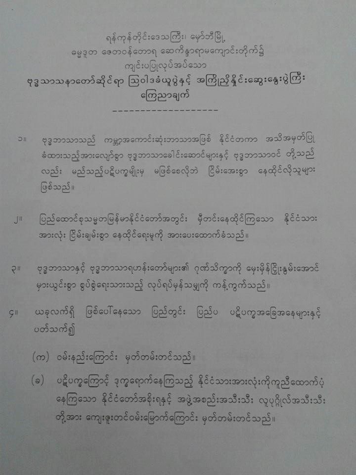 ၃။ ဗုဒၶဘာသာႏွင့္ ဗုဒၶဘာသာ ရဟန္းေတာ္မ်ား၏ ဂုဏ္သိကၡာကို ေမွးမွိန္ညႈိးႏြမ္းေအာင္ မွားရြင္းစြာ စြတိစဲြေရးသားသည့္ လုပ္ရပ္မွန္သမွ်ကိုကန္႔ကြက္သည္။