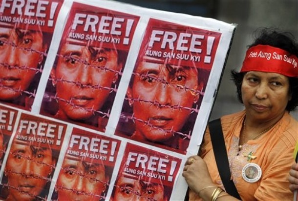 ဖိလစ္ပုိင္ႏုိင္ငံ၊ ျမန္မာသံရုံးေရွ႕မွ လႈပ္ရွားမႈမ်ား။ ဖိလစ္ပုိင္ရိွ ဒီမုိကေရစီအေရး လႈပ္ရွားသူမ်ားက ေဒၚေအာင္ဆန္းစုၾကည္ကုိ ေထာက္ခံၾကသည္။