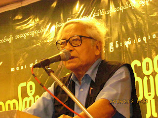 သူ႕ဖက္ကေတာ့ လူငယ္ေနရာေပး သူဖယ္မယ္ဆိုတာ မ်ိဳးေပါ့ဗ်ာ။ အဘအယူအဆအရ ကုလားထုိင္ဖက္ ေသရင္ … လူတင္ေသတာ မဟုတ္ဘူး။ ကုလားထုိင္ပါ ေရာေသမယ္။ ဆိုလိုတာက သူ သတ္မွတ္ခ်က္တစ္ခု အထိလုပ္မယ္ … ျပီးရင္ ေတြးမယ္၊ ေငးမယ္၊ ေရးမယ္၊ ဖတ္မယ္၊ ခရီးေတြေလွ်ာက္သြားမယ္ … ဆိုတာမ်ိဳးကိုး။ ခုေတာ့ … ဒီဟာမျဖစ္လာေတာ့ဘူး၊ ထင္တယ္။ အဘအသက္လည္း ရွစ္ဆယ့္ေလးျဖစ္ေနျပီ။