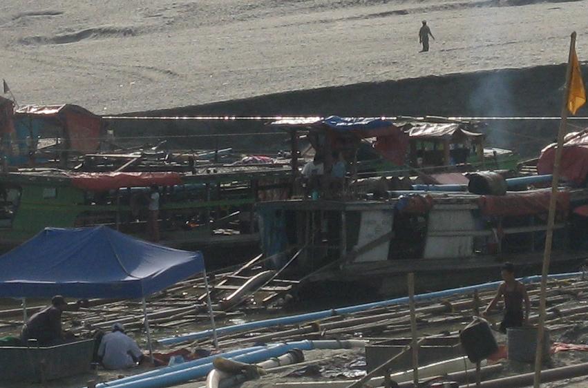 နာမည္ေက်ာ္ သူေဌးႀကီး ဦးေတဇ ပုိင္ဆုိင္သည့္ ထူးကုမၸဏီ၏ လုပ္ကြက္မ်ားကုိ ခ်င္းတြင္းျမစ္ရိွ ရိုးလာေရႊေမွာ္တြင္ ေတြ႔ႏုိင္သည္။ (ဓာတ္ပုံမ်ား-ခ်င္းတြင္းနတ္သမီး)