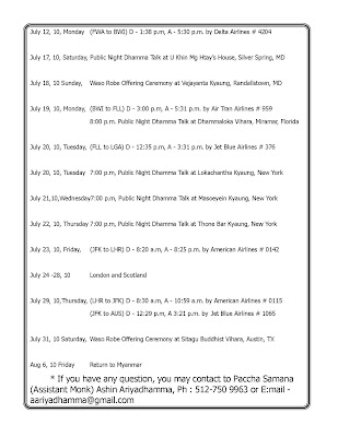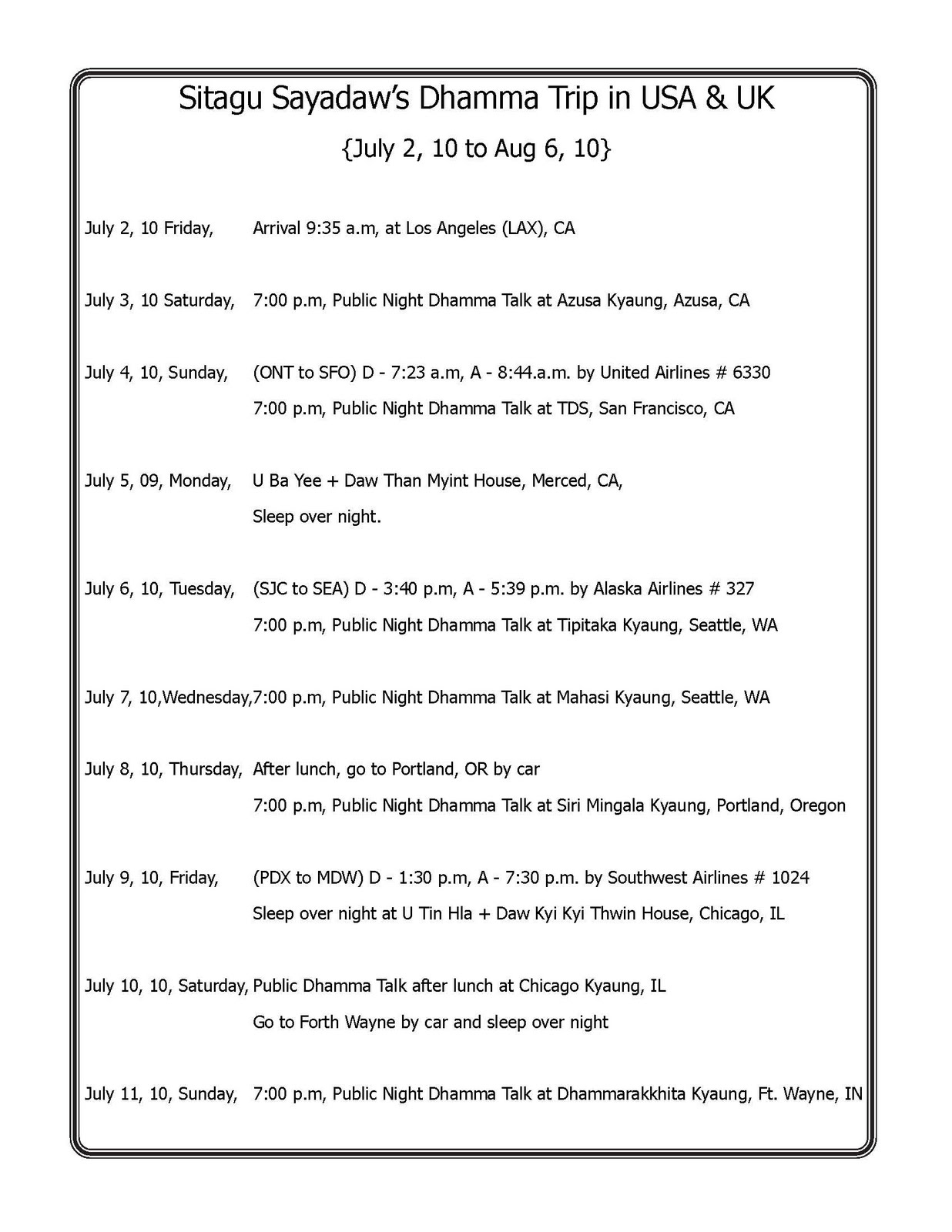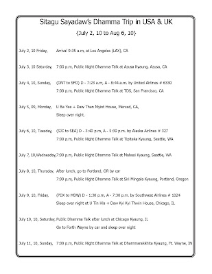 ဆရာေတာ္ၾကီးသည္ ဇူလိုင္လ ၃ ရက္တြင္ အယ္လ္ေအတြင္ တရားပြဲ တခု၊ ဇူလိုင္လ ၄ ရက္တြင္ ဆန္ဖရန္စၥကိုတြင္ တရားပြဲ တခု က်င္းပေပးမည္ ျဖစ္ျပီး ဇူလိုင္ ၃၁ ေန႔ အထိ အေမရိကန္ျပည္နယ္မ်ားအႏွံ႔ တရားပြဲမ်ား က်င္းပရန္ စီစဥ္ထားေၾကာင္း သိရသည္။ သည္ေနရာမွာ တရားပြဲ အစီအစဥ္မ်ားကို ၾကည့္ႏိုင္ပါျပီ။