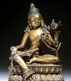 တာရာေဒဝီ၊ နံရံေဆးေရးပန္းခ်ီ၊ အပယ္ရတနာလႈိင္ဂူဘုရား၊ ပုဂံ တိဗက္ နဲ႔ တ႐ုတ္ႏိုင္ငံတဝိုက္မွာ အေတြ႔ရမ်ားတဲ့ မၪၨဴသီရိ ဘုရားေလာင္းပံုေတြက ပဒုမာသန တင္ပ်ဥ္ေခြ ထိုင္ၿပီး ညာလက္မွာဓား၊ ဘယ္လက္က စာအုပ္ကိုင္ပါတယ္။