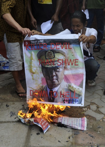 စစ္အာဏာရွင္ကို လက္ခံၾကိဳဆိုသျဖင့္ တိုင္းျပည္အႏွံ႔တြင္ ျမန္မာဒီမိုကေရစီေရး ေထာက္ခံ အားေပးသူမ်ားက ျခိန္႔ျခိန္႔သဲေအာင္ ကန္႔ကြက္ ဆႏၵျပ ရႈတ္ခ်ခဲ့ၾကသည္။ ဓာတ္ပုံ – Daylife Photo