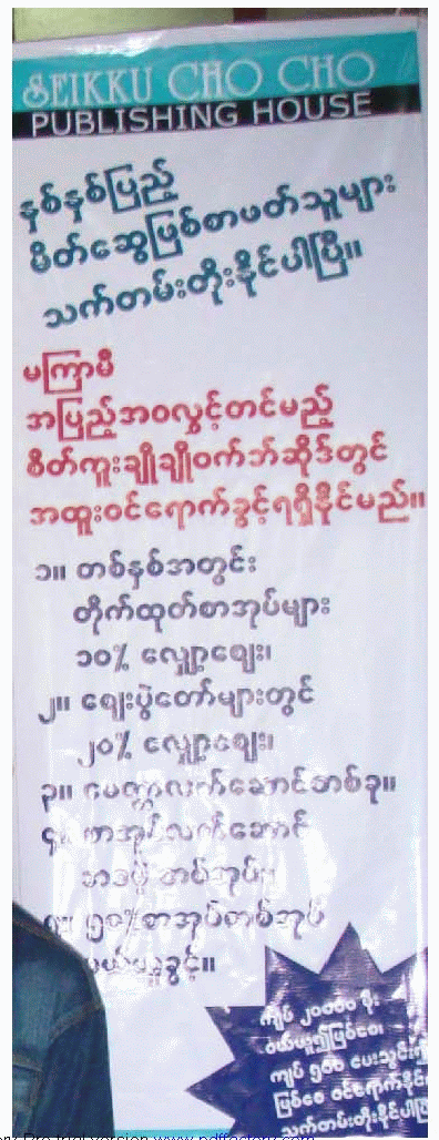 လြန္ခဲ့သည့္ ၾသဂုတ္လ ၄ ရက္က ရန္ကုန္ျမိဳ႔၊ ေလာကနတ္ျပခန္းတြင္ ကဗ်ာဆရာစန္းဦး၏ စိတ္ကူးခ်ဳိခ်ဳိစာအုပ္တိုက္က ၎ ၂ ႏွစ္ျပည့္ စာအုပ္ပြဲေတာ္ ျပဳလုပ္ခဲ့သည္ကို ေတြ႔ရစဥ္။ စာအုပ္မ်ဳိးစုံ၊ အမ်ားအျပားကို စာခ်စ္သူမ်ားက အားေပးၾကည့္ရႈ ၀ယ္ယူခဲ့ၾကသည္ ဆိုသည္။ ၎တို႔ ၀က္ဆိုက္လည္း လႊင့္တင္ဦးမည္ဟု ေၾကာ္ျငာတြင္ ေရးထားသည္။ (ဓာတ္ပုံ – မိုးမခ)