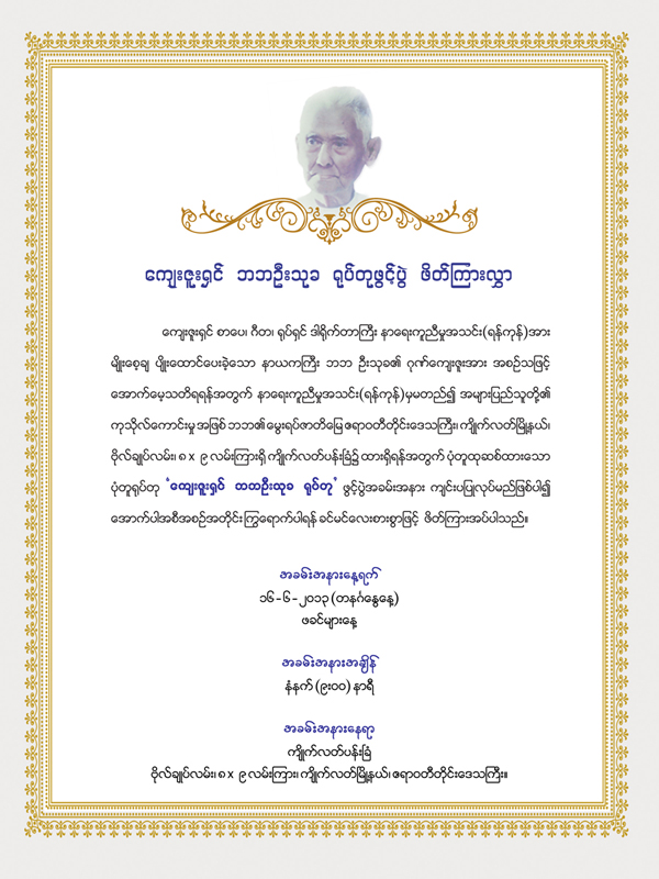 ေလာကႀကီးအား ၿငိမ္းခ်မ္းမႈအလွဆင္ေပးခဲ့ေသာ… ကြ်န္ေတာ္တို႔အတြက္ ၿငိမ္းခ်မ္းမႈလမ္း ေဖါက္ေပးခဲ့ေသာ… ကြ်န္ေတာ္တို႔အတြက္ ပရဟိတမ်ဳိးေစ့မ်ား ခ်ေပးခဲ့ေသာ ေက်းဇူးရွင္ စာေရးဆရာ၊ ဒါရုိက္တာ၊ ရုပ္ရွင္ဂီတပညာရွင္၊ နာေရးကူညီမႈအသင္း(ရန္ကုန္) နာယကၾကီး ဖခင္ႀကီး ဘဘဦးသုခ၏ ဂုဏ္ေက်းဇူးမ်ားကို အစဥ္သျဖင့္ အမွတ္ရေစလိုေသာဆႏၵျဖင့္ ထုဆစ္ထားေသာ ေက်းဇူးရွင္ ဘဘဦးသုခ ရုပ္ထုဖြင့္ပြဲအား အေဖမ်ားေန႔ (၁၆.၆.၂ဝ၁၃ – တနဂၤေႏြေန႔) တြင္ ေအာက္ေဖၚျပပါ ေနရာ၊ အခ်ိန္တြင္ က်င္းပမည္ျဖစ္ပါေၾကာင္း အသိေပးအေၾကာင္းၾကားအပ္ပါသည္။