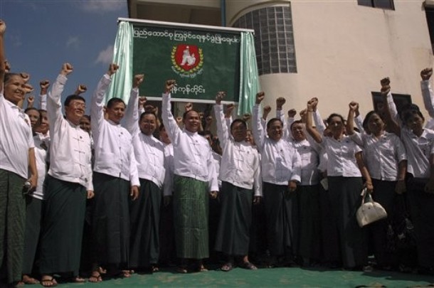 ၾသဂုတ္ ၂၂၊ ၂၀၁၀AP သတင္းဌာနက ေသာၾကာေန႔မွာ ရုိက္ကူးထားတ့ဲ ျပည္ခုိင္ျဖဳိးပါတီ ရုံးဖြင့္ပဲြတခုက ျပည္ခုိင္ျဖဳိး ေခါင္းေဆာင္ ၀န္ႀကီးမ်ား၊ ေနာက္လုိက္မ်ား ဓာတ္ပုံ။