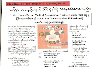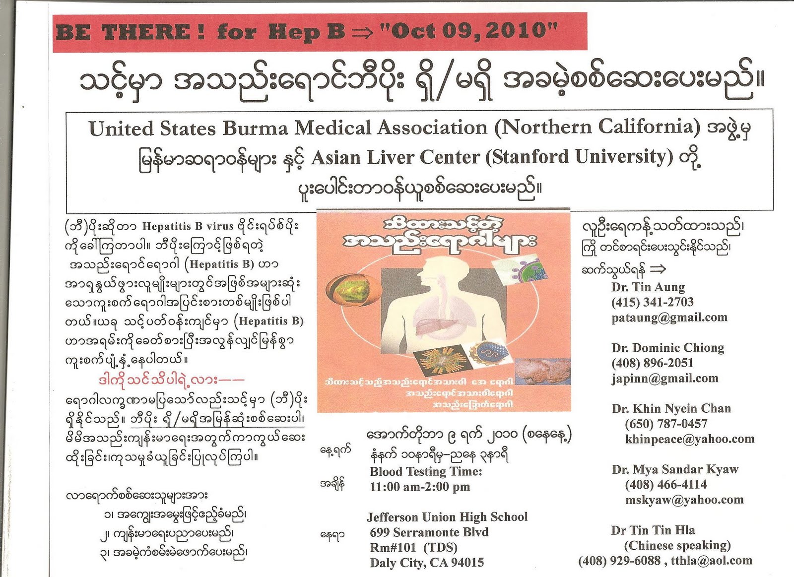 ေရွ႔လာမယ့္ တလေက်ာ္၊ ေအာက္တိုဘာ ၉ ရက္ မနက္ ၁၀ နာရီကေန ညေန ၃ နာရီအထိကို ေဒလီစီးတီးျမိဳ႔၊ ျမန္မာပြဲေတာ္ေတြ လုပ္ေနက်ေနရာျဖစ္တဲ့ ဂ်က္ဖာဆန္ယူနီယန္ အထက္တန္းေက်ာင္းေနရာမွာ ျမန္မာဆရာ၀န္မ်ားအသင္း (ေျမာက္ပိုင္းကယ္လီဖိုးနီးယား) နဲ႔ စတင္းဖို႔တကၠသိုလ္က Asian Liver Center (Stanford) ပူးေပါင္းျပီး အခမဲ့ စစ္ေဆးေပးမယ္လို႔ ေၾကညာခ်က္ ထုတ္ထားပါတယ္။ လက္ကမ္းစာေစာင္ကို အထက္ပါအတိုင္း ျဖန္႔ေ၀ထားတာကို ေတြ႔ရပါတယ္။