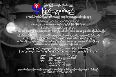 စက္တင္ဘာ ၂၅ ရက္ကို ၾကိဳတင္ စာရင္းတို႔ထားျပီး အေရာက္လာၾကဖို႔ အယ္လ္ေအျမိဳ႔နယ္က ျပည္သူ႔ဂုဏ္ရည္ မိတ္ေဆြေတြက ေႏြးေထြပ်ဴငွာစြာ ဖိတ္လိုက္ပါတယ္။ ၂၀၁၁ ခုႏွစ္ လာမယ့္ႏွစ္ ေမလ ၀န္းက်င္မွာ ျပည္သူ႔ဂုဏ္ရည္ ဆု ခ်ီးျမွင့္ ဂုဏ္ျပဳပြဲ က်င္းပမွာ ျဖစ္လို႔ ယခုကတည္းက အေမရိကန္ျပည္က ပါ၀င္ အားေပးၾကမယ့္ ျမဳိ႔နယ္ ၁၅ ျမိဳ႔နယ္ေက်ာ္ အထဲက ျမိဳ႔နယ္အလိုက္ ရန္ပုံေငြ ရွာေဖြပြဲတခုအျဖစ္ အမ်ားျပည္သူေတြ ပိုျပီး သိရွိေစဖို႔၊ နားလည္ ရင္းႏွီးေစဖို႔ ေဆာင္ရြက္တဲ့ အစီအစဥ္ ျဖစ္ပါတယ္။