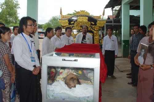 ေန႔လည္ ၂း၀၀ နာရီအခ်ိန္တြင္ ကြယ္လြန္သူ ဦးလွျမင့္ အသက္ ၈၁ ႏွစ္၏ နာေရးလမ္းေၾကာင္းကို ရန္ကုန္ေဆး႐ံုႀကီး အေအးခန္းမွ ေရေဝးသုႆန္သို႔ ၂၉ ႏွစ္ေျမာက္ မဂၤလာ အထိမ္းအမွတ္အျဖစ္ ဦးေက်ာ္သူ + ေဒၚေရႊဇီးကြက္တို႔သည္ နာေရးကူညီမႈအသင္း (ရန္ကုန္) အသင္းသူ/သားမ်ားႏွင့္အတူ လိုက္လံပို႔ေဆာင္ သၿဂႋဳလ္ေပးခဲ့ပါသည္။