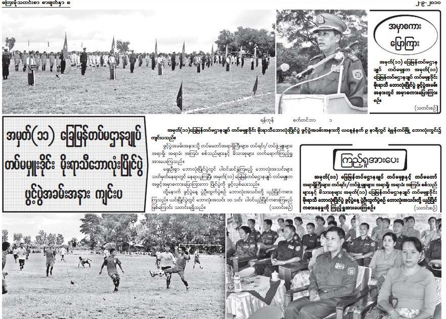 ဒီသတင္းကေတာ့ တပ္မမွဴးရဲ႕ သတင္းပါပဲ။ သူ႔ပုံက ဒီသတင္းမွာ ၂ ပုံေတာင္ ပါသဗ်။ ိပဲြက သူ႔ပဲြျဖစ္တယ္၊ ပဲြမွာ သူ ဘာလုပ္တယ္ စသျဖင့ ္ေရးထားတယ္။ သုိ႔ေသာ္လည္း သူ႔နာမည္ေတာ့ မထည့္ထားဘူး။ ဒါလည္း ဗုိလ္ခ်ဳပ္ႀကီးတုိ႔ သတင္းစာ စတုိင္ပဲ ထင္ပါရဲ႕။ SPDC journalism ျမန္မာလုိ ေျပာရရင္ နအဖစာနယ္ဇင္းအေရးအသားေပါ့ဗ်ာ။