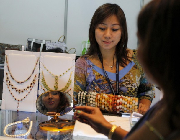 ႏုိင္ငံတကာမွ ေက်ာက္မ်က္ လုပ္ငန္းရွင္မ်ား ထုိျပပဲြတြင္ ၀င္ေရာက္ျပသေနၾကသည္။ (ဓာတ္ပုံ – Reuters)