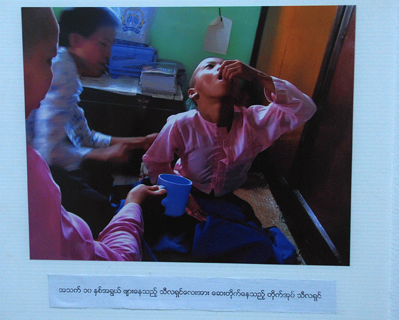 ဖိုတိုအက္ေဆး တစ္ခုမွ ေနမေကာင္းျဖစ္သျဖင့္ ေဆးေသာက္ေနသည့္ သီလရွင္ငယ္ ဓါတ္ပံု