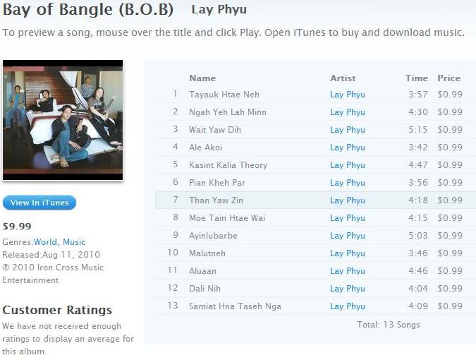 http://itunes.apple.com/us/album/than-yaw-zin/id387819567?i=387819809 သုိ႔ သြားလွ်င္ ေလးျဖဴသီခ်င္း အေရာင္းဌာနကုိ ေတြ႔ရမည္။ေလးျဖဴ၏ “ဘဂၤလားပင္လယ္ေအာ္” စီးရီးမွ သီခ်င္းမ်ားကုိ iTune အေကာင့္ ရိွသူတုိ႔ ေဒါင္းလုတ္ လုပ္ႏုိင္ၾကေပၿပီ။ သုိ႔ေသာ္လည္း တပုဒ္ ေဒါင္းလုတ္ လုပ္လွ်င္ ၁ ေဒၚလာ ($ 0.99) ကုန္က်မည္ျဖစ္သည္။