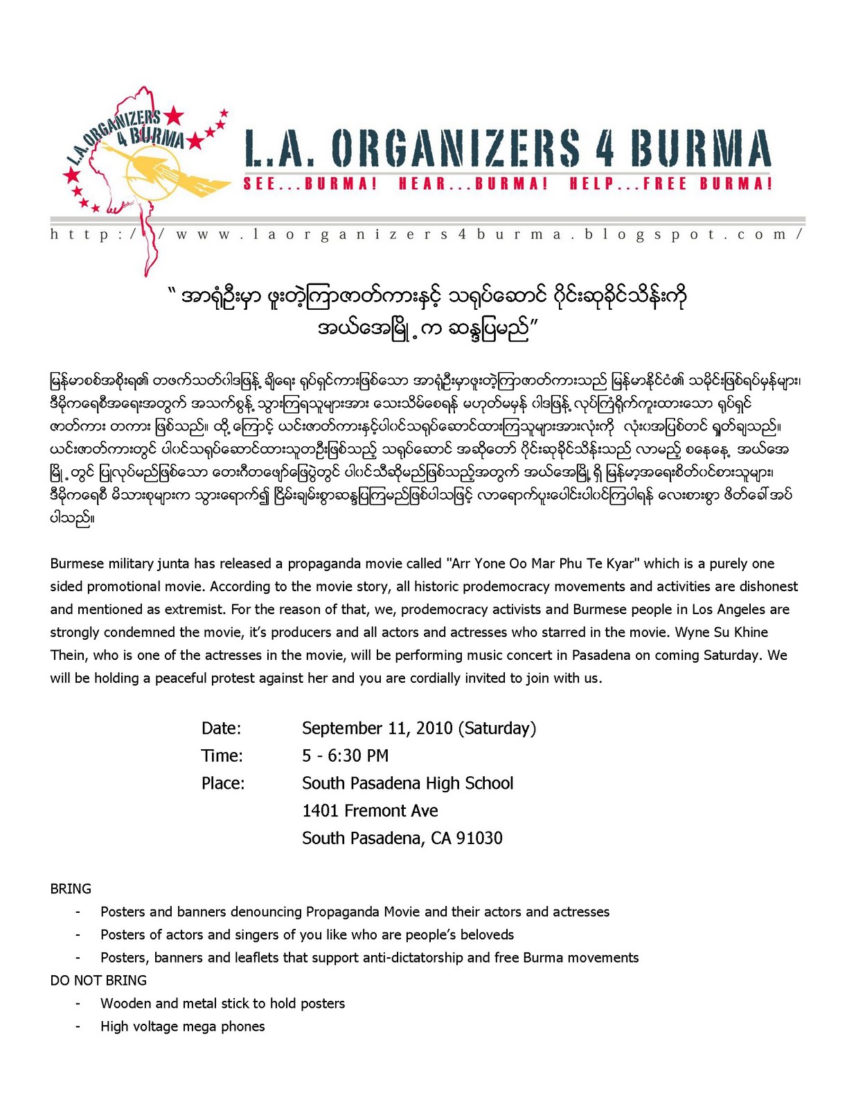 နက္ျဖန္မွာ က်င္းပမယ့္ အယ္လ္ေအက ျမန္မာစတိတ္ရွဴိး ကို အယ္လ္ေအၾသဂႏိုက္ဇာႏွင့္ ျမန္မာဒီမိုကေရစီအေရး လႈပ္ရွားသူမ်ား စုေ၀းဆႏၵျပ ကန္႔ကြက္ၾကမည္ ျဖစ္သည္။ ၎တို႔ အစီအစဥ္ကို သည္ေနရာမွာ ၾကည့္ႏိုင္သည္။ ျမန္မာစစ္အစုိးရ၏၀ါဒျဖန္႔ကား၏ သရုပ္ေဆာင္သူတဦး ပါ၀င္သည့္ စတိတ္ရွဴိးပြဲမ်ား အေမရိကန္အႏွံတြင္ ၾသဂုတ္လဆန္းကတည္းက လိုက္လံကျပလ်က္ရွိရာ ျမန္မာ့ဒီမိုကေရစီေရး လႈပ္ရွားသူတို႔က ကန္႔ကြက္ဆႏၵျပလ်က္ ရွိသည္။