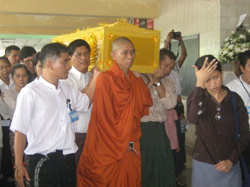 ယေန႔ ၂၅.၉.၂၀၁၀ (စေန) ေန႔ နံနက္ (၁၀း၀၀) နာရီအခ်ိန္တြင္ ေရေဝးသုႆန္၌ နာေရးကူညီမႈအသင္း (ရန္ကုန္)က အလွဴမီနီယမ္ မွန္ေခါင္းျဖင့္ စ်ာပနအခမ္းအနား ျပင္ဆင္ေပးကာ အသင္းသူ/သားမ်ားတို႔မွ မီးသၿဂႋဳဟ္ျခင္း အခမ္းအနားကို က်င္းပေပးခဲ့ပါသည္။ ယင္း အခမ္းအနားတြင္ က်န္ရစ္သူ မိသားစုဝင္မ်ားႏွင့္အတူ ႏိုင္ငံေရးေလာကမွ လူပုဂိၢဳလ္မ်ား၊ စာေပေလာကမွ ကဗ်ာ ဆရာ၊ စာေရးဆရာမ်ား၊ ပရဟိအဖြဲ႔အစည္းမ်ားမွ လူမႈေရးသမားမ်ား စံုညီစြာ လာေရာက္ၾကသည္။