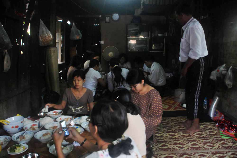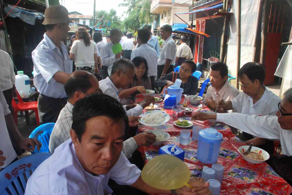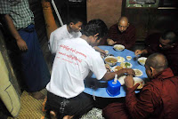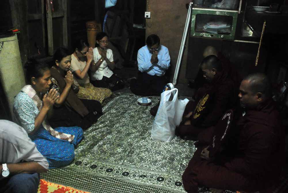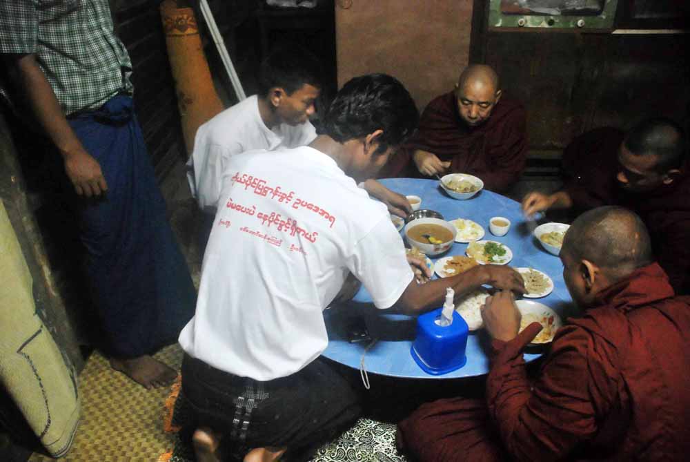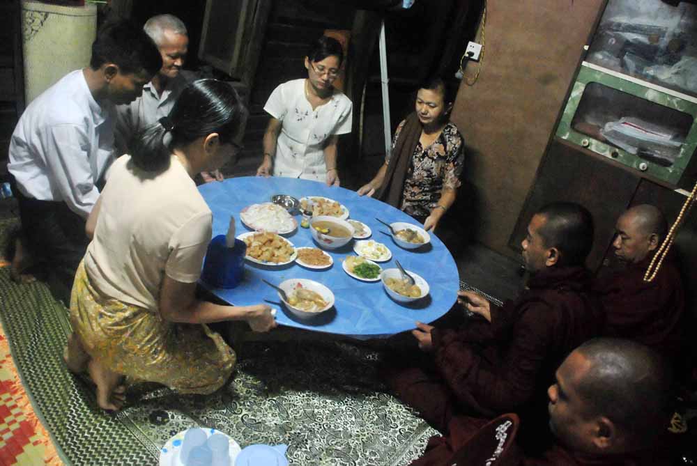 သံဃာေတာ္ ၃ ပါးကို နံနက္ ၅ နာရီ ၁၅ မိနစ္မွာ အာ႐ံုဆြမ္းကပ္လွဴၿပီး သကၤန္းဒြိစံုမ်ားကို ဆက္ကပ္ လွဴဒါန္းခဲ့ၾကပါတယ္။ ဆြမ္းေကၽြးကို လိႈင္ၿမိဳ႕နယ္ ၁၃ ရပ္ကြက္၊ သီရိၿမိဳင္ ၃ လမ္း၊ အိမ္အမွတ္ ၁၉ ေနအိမ္မွာ က်င္းပခဲ့တာပါ။