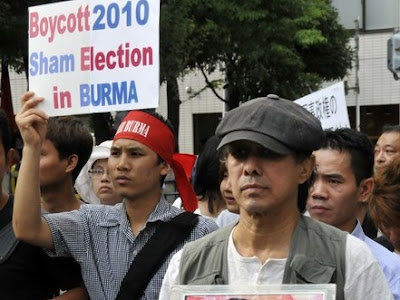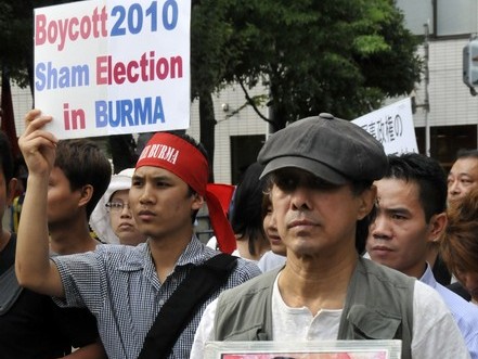 ေအာက္တုိဘာ ၃၊ ၂၀၁၀ “—မဲမထည့္ရန္ အခိုင္အမာ ဆံုးျဖတ္ခ်က္ ခ်ထားၿပီး ျဖစ္သည္—-” ဂ်ပန္ႏုိင္ငံေရာက္ ျမန္မာျပည္သားမ်ား ၿပီးခ့ဲသည့္လ ၁၈ ရက္ေန႔က စစ္အစုိးရကုိ ဆန္႔က်င္ ကန္႔ကြက္ေနပုံ။ ဆႏၵျပသူ ၃၀၀ ခန္႔က ေဒၚေအာင္ဆန္းစုၾကည္ အပါအ၀င္ ႏုိင္ငံေရး အက်ဥ္းသားမ်ားကုိ လြတ္ေပးရန္ ေတာင္းဆုိၾကၿပီး ႏုိ၀င္ဘာ ၇ ရက္ ေရြးေကာက္ပဲြကုိ သပိတ္ေမွာက္ရန္ ေတာင္းဆုိၾကသည္။ (ဓာတ္ပုံ-getty images)