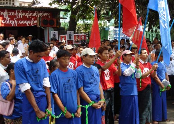 နာဂစ္ အေျခခံဥပေဒ ေခၚ ၂၀၀၈ အေျခခံဥပေဒ ဆႏၵခံယူပဲြတြင္ ကန္႔ကြက္မဲ ထည့္ၾကရန္ လႈံ႔ေဆာ္ခ့ဲေသာ NLD ရုံးေရွ႕မွ ႏုိင္ငံေရးသမားမ်ား။ ထုိသုိ႔ လႈံ႔ေဆာ္ေနေသာ္လည္း ထုိအေျခခံဥပေဒကုိ မဲေပးသူ ၉၀ ရာခုိင္ႏႈန္းေက်ာ္က ေထာက္ခံသည္ဟု စစ္အစုိးရက ေၾကညာခ့ဲသည္။ (ဓာတ္ပုံ-မုိးမခ)